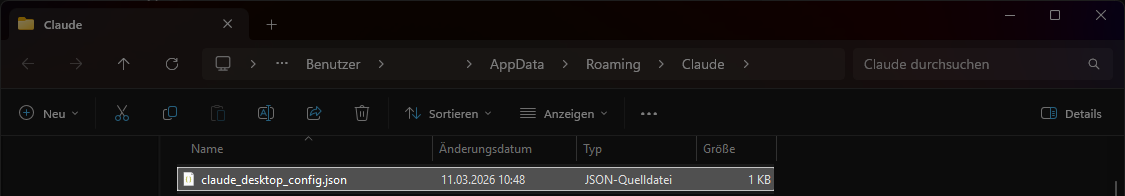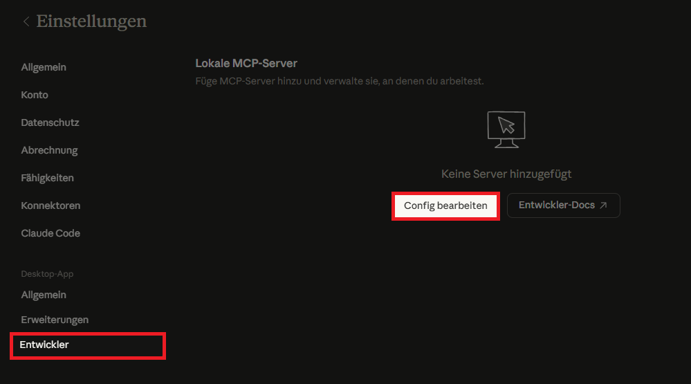 Bei Claude Desktop müssen Sie eine Konfigurationdatei bearbeiten. Diese erreichen Sie, indem Sie unter Einstellungen > Entwickler den Punkt Config bearbeiten auswählen.