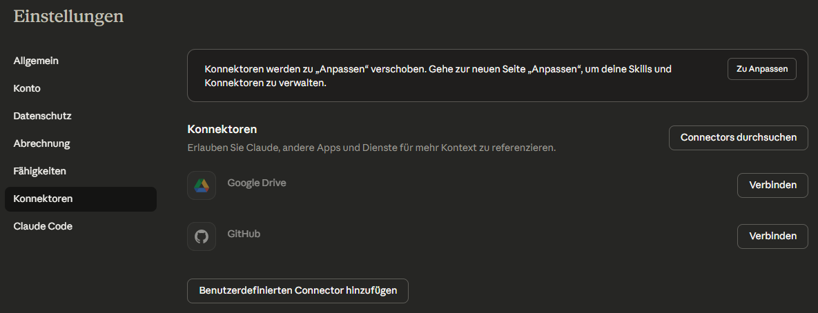 Bei Claude Web navigieren Sie zu den Einstellungen und wählen dort den Bereich Konnektoren aus. Klicken Sie anschließend auf Benutzerdefinierten Konnektor hinzufügen. Dort können Sie einen Namen sowie die entsprechende URL für den MCP-Server angeben. Für Customa tragen Sie die URL https://mcp.customa.biz/mcp dort ein.