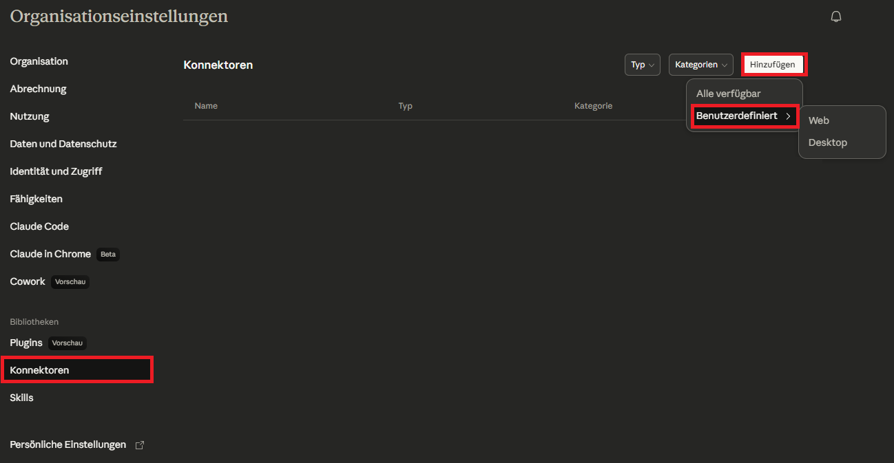 Falls Sie eine Teams-Variante von Claude nutzen, navigieren Sie zu den Organisationseinstellungen und öffnen dort den Bereich Konnektoren. Klicken Sie auf Hinzufügen und wählen Sie anschließend Benutzerdefiniert aus.